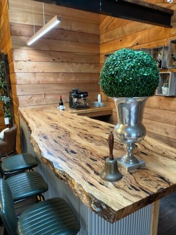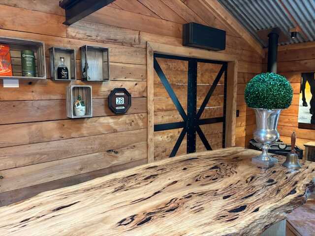 A stunning piece of Blackbutt Timber made into a dramatic feature bench within the local Clevedon Woolshed store. Our client also sourced Macrocarpa boards which have been utilised as paneling internally for the walls and barn style seen in the images below.